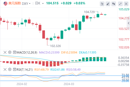 4月1日,周一欧市盘中,美元指数变化不大,报104.515,小幅上涨0.03%。
