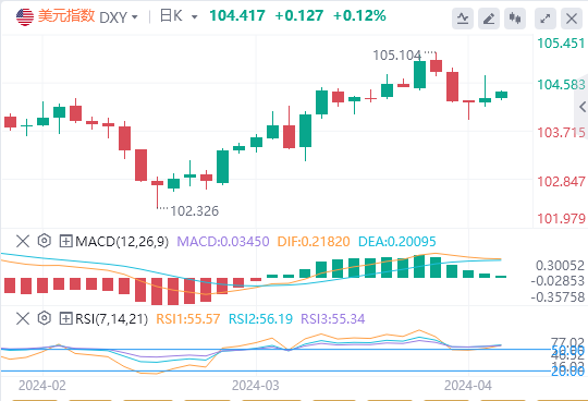 4月8日,周一欧市盘中,美元指数小幅上涨至104.359,略有走强。