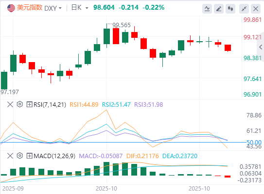 10月28日,美元指数连续第二天扩大跌幅,周二亚洲时段交投于98.60附近。日线图的技术分析显示,美元指数测试上升通道形态的下边界,表明势头可能从看涨转向看跌。