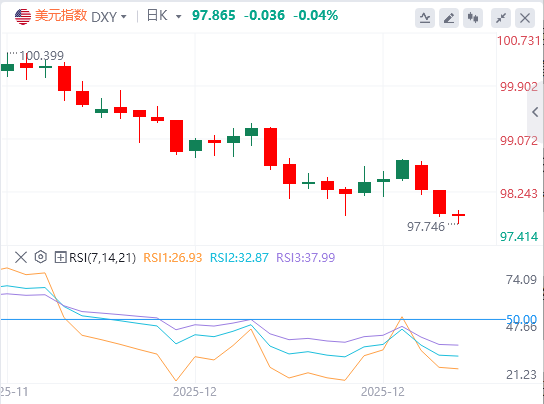 12月24日,美元指数在欧洲交易时段收复日跌幅并交易于97.90左右后保持持平。