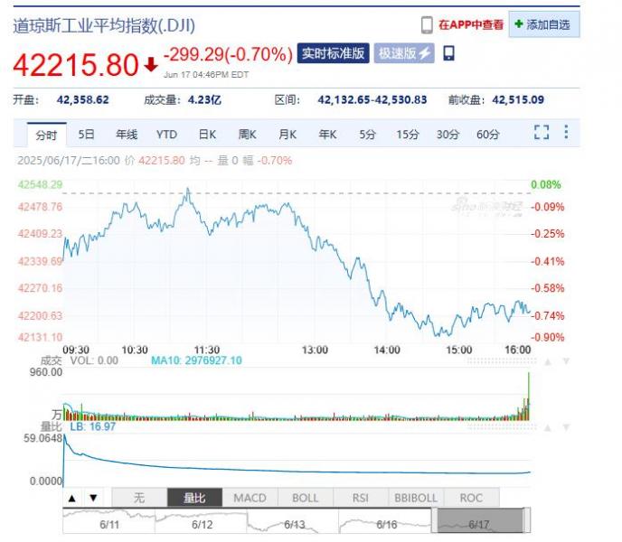 一、美股股市:道指跌299.29点,跌幅为0.70%,报42215.80点;纳指跌180.12点,跌幅为0.91%,报19521.09点;标普500指数跌50.39点,跌幅为0.84%,报5982.72点。特斯拉(TSLA.US)跌3.88%。纳斯达克中国金龙指数跌1.77%。