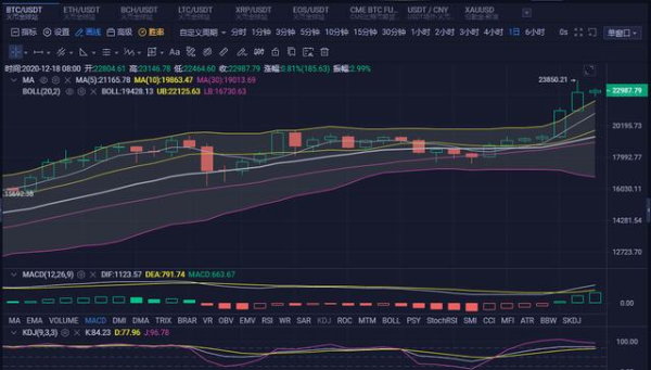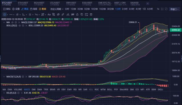 小时图来看:BOLL通道持续向上收口,币价围绕着小时线中轨附近盘旋;附图指标中;MACD快慢线在零轴上方形成金死叉向下发散,红色色量柱稳定放量,KDJ三线有聚合向上趋势;昨日的比特币基本没有什么技术面来看的,自从前天晚上到达20000美元关口后,币价就是一路飙升,昨日币价一度上升至23850高点,在行情站上20000后,市场波动较大,千点波动是正常的,早间一度最低来到22321美元位置 ,短期受到支撑,目前有所反弹。