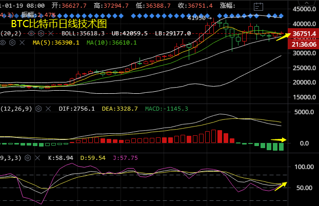 比特币(BTC),日线上看震荡之中小幅收阳,算是在震荡之中看到了多头反击的希望。比特币从凌晨的小碎阳震荡式上行到今日早盘的一波拉涨再度冲击37000美元关口,而上方隔日在冲击37500美元一带后迎来一波跳水行情,今日该位置亦是我们关注的短线阻力,关键阻力还是位于38000美元关口,只有当币价站稳该位置之上,那么下一步冲击40000美元整数关口也是指日可待。而下方币价亦是多次下探未破,下方的支撑位不断上移,可见下方支撑强势,短线需关注35500美元一带支撑(隔夜回撤低点)。短周期KDJ技术指标粘合运行,附图MACD下行动能放量,但是比特币并没有迎来大跌行情,相反只是调整,预计震荡的行情还将继续维持。综上所述:持久震荡,必有破位,震荡的时间越长,爆发力也就越大,这一波行情至少有3000点的利润,你准备好了吗。对于今日的行情操作上谈老师依旧是建议低多为主。若对技术行情以及消息面解读把握不定或者持有套单的朋友皆可与谈老师进行探讨。