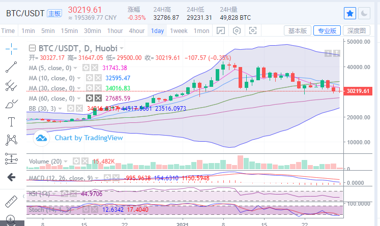 短周期四小时图上看,布林带开口姿态,行情在中下轨区域运行,目前价格在30500位置附近,反弹向上受阻,目前走势处于承压节奏当中,跌势尚未消散,后市大概率还将回测下方支撑强度,所有操作上不建议盲目追涨,稳健还是回踩做多。