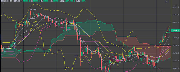 我们从比特币4小时图上可以看到,从3月14日的高点61800附近出现下跌,最低53000附近,回调接近9000美元,如果不是昨晚美联储的影响,那么接下来空头趋势无疑。但是,现在受到消息面的影响,我们就不得不重新看待。技术面上来讲上方60500以及高点61800肯定是目前的强压位,昨晚之前的压力是在57000一线,昨晚突破后,那么这个位置根据道氏理论顶底转换会形成支撑。