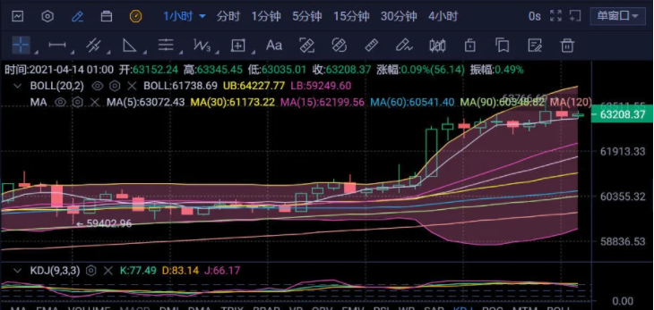比特币于昨日受到消息面影响破位历史新高后,持续性上涨,最高到达63800,目前盘面出现高位震荡,是在为继续冲击新高蓄力还是出现大跌前奏的信号,下面我们来看盘面。先来看4小时走势,币价目前已经突破布林带上轨运行,布林带整轨呈张口状,MA各均线皆齐头向上,而kdj指标于超卖区有拐头向下趋势,macd绿色动能柱仍旧持续增量,可见目前多头情绪依旧较浓,短周期小时走势来看,币价强力拉升后开启了高位震荡趋势,kdj指标死叉向下已形成,而macd绿色动能柱在持续缩量,那么居士认为目前多头情绪依旧浓重,操作思路上以回调做多为主!