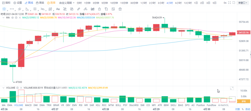 比特币昨日触碰56424一线高位后,高位承压走出下跌行情,多头逐渐疲软,截止昨日晚间收盘,币价最低跌至52484一线,日内跌幅达到4000个点,当下币价有所反弹运行于53400一线。从四小时线上看,比特币昨日高位承压回踩,是稍微有点起色的多头再次遭受打压,且布林带有微微向下开口趋势,市场空头逐渐放量,日内不排除有继续下跌的可能。