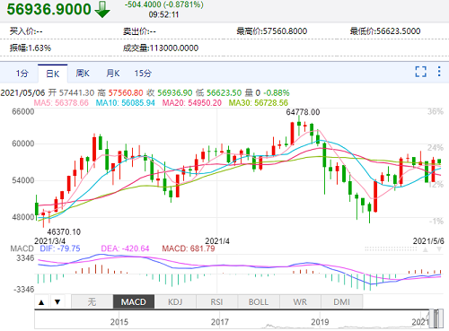 操作建议:围绕56500-56800附近一线进场做多,目标57600-57800附近一线止盈出局。
