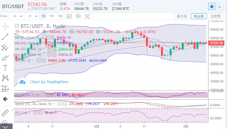 日线级别的图上看,昨日价格阳线结尾,日内行情并未如预期突破59000一线,目前是承压回测支撑,低位逼近布林带中轨支撑,后续若是跌破56800位置,行情有望进一步向56000一线迈进的风险。附图MACD两线保持向上放量姿态,RSI和Stoch走势微微下行,由此可见日内行情还是偏向震荡。上方压制关注59000一线,突破可以考虑轻仓追多。
