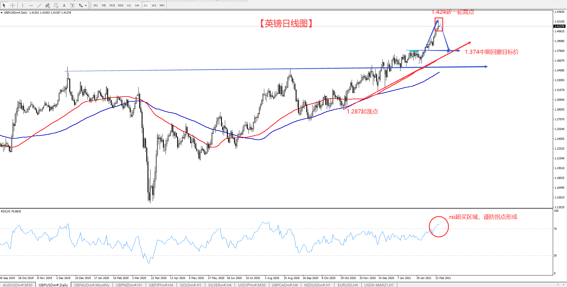 从技术面来看,英镑日线顺利在上一个交易日给出顶部的“射击之星”k线信号。在亚盘阶段的冲高之后,英镑并没有出现新一轮的高点,说明这段上行已经在开始逐渐缩减,另外rsi指标的超买随时将可能出现拐头,再结合着昨天日线收出的“射击之星”,英镑在这轮的拉升当中1.424将成为英镑本轮上行的顶部。