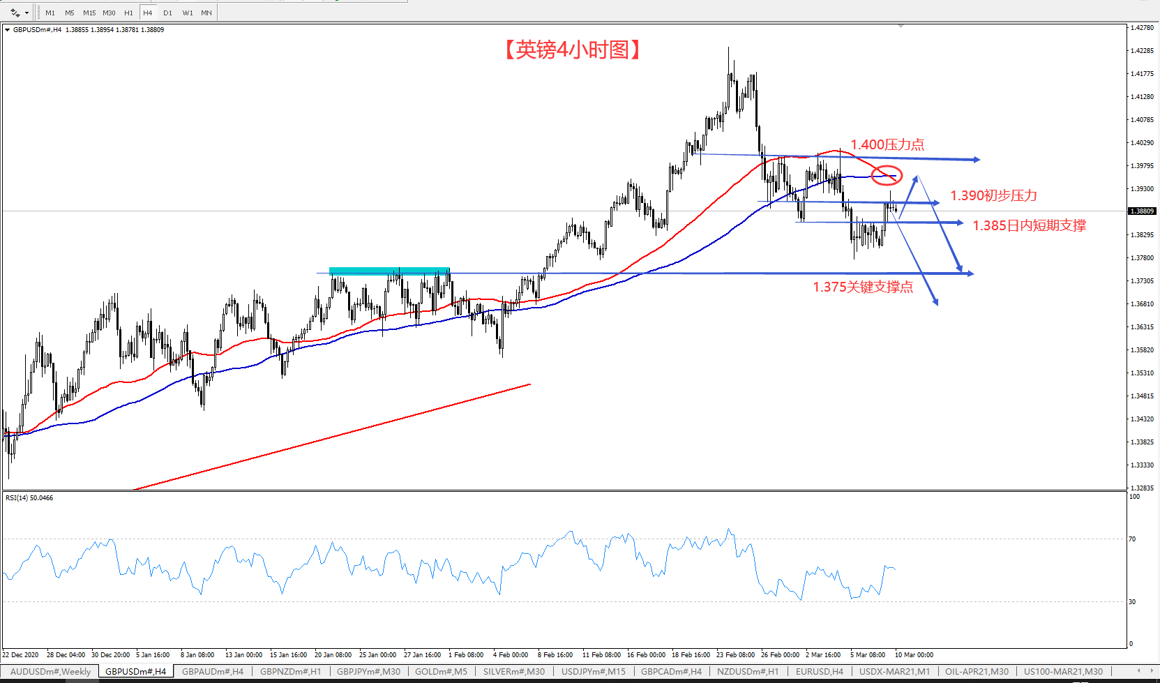 在耶伦的安抚性言论和1.9万亿援助法案达成的背景下,淡化了通胀失控的前景,美债收益率展开小幅的回落,自周一的1.6%已经回落至1.5%。美元也在这个时间段内,进一步走低,目前已经再次回到92的下方,虽然目前还没有展开加速行情,但就目前的形式上看,美元还是摆脱不了这段回补的行情。英镑也在美元的回落当中进一步走高,也符合了我的预期。