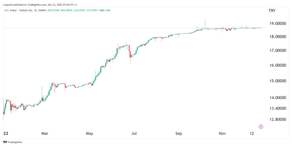 尽管有重大市场消息,但过去几个月美元/土耳其里拉的汇率一直在窄幅波动。土耳其里拉回落至18.71,过去几个月一直是这个水平。这一价格比今年以来的高点19.336低了几个点。到2022年,这一数字增长了47%以上。那么,2023年土耳其里拉的走势会如何呢?
