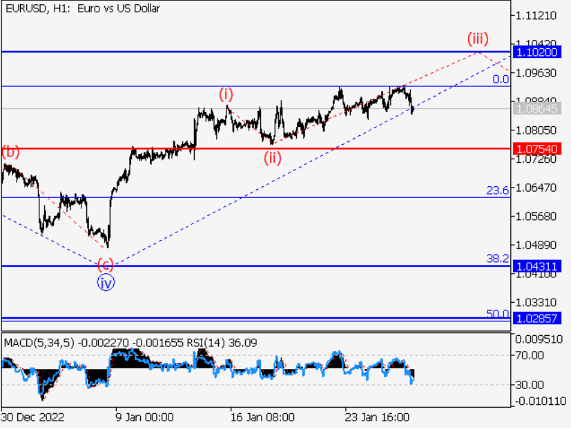 货币分析:一个较大a度的看跌波可能在日线图上完成,А的第五波(5)构成了它的一部分。显然,一个上升波B开始在H4图上发展,第一个反趋势波(A)度较小的B继续形成作为它的一部分。H1图:假设1的波v在展开,v的波(iii)在内部展开。如果这一假设是正确的,该货币对将继续上涨至1.1020 - 1.1300的水平。在这种情况下,1.0754的水平非常关键。其突破将允许该货币对继续下跌至1.0431 - 1.0285的水平。