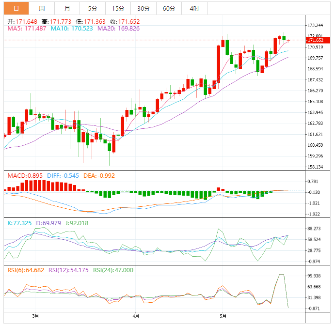 另一方面,如果有信心突破上周的高点172.33,将会支撑该货币对在2017年1月25日的高点174.18之后再创7年新高173.00。