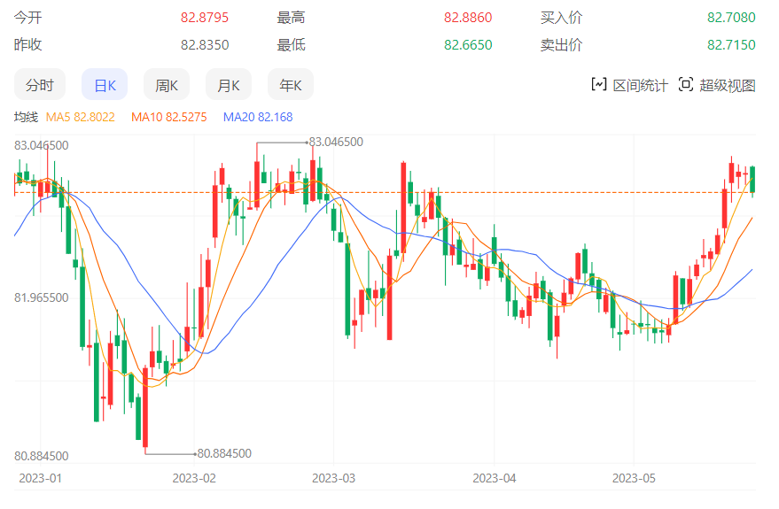 相反,如果日收盘价突破去年12月以来的下行阻力线(接近83.00的整数),将毫不犹豫地挑战2022年创下的83.40左右的历史高点。