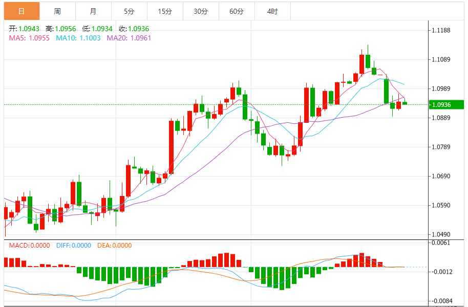 周五,欧元/美元徘徊于1.0936关口下方,现交投于1.0935附近,跌幅0.08%。