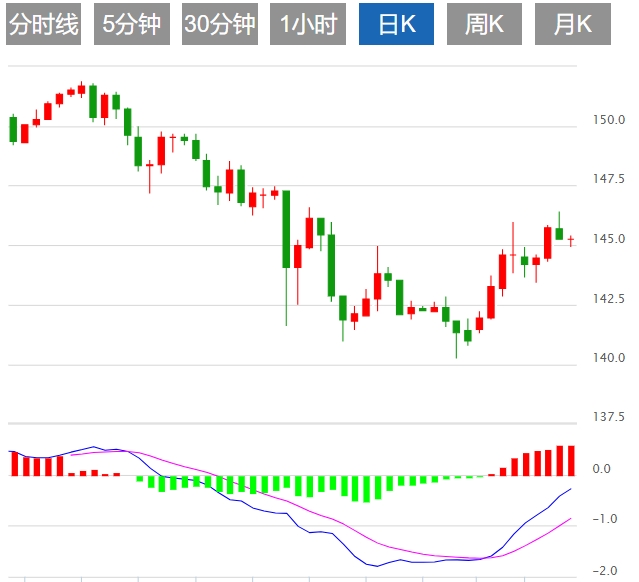 日线图上,美元/日元隔夜市场上再度挑战146水平,虽有穿越但收盘未能企稳该水平之上,表明该水平的阻力较为强顽。目前汇价渐渐脱离布林带上轨线呈下行态势,如果随后收盘价低落于144之下,那么美元/日元此轮的反弹走势有可能告结。
