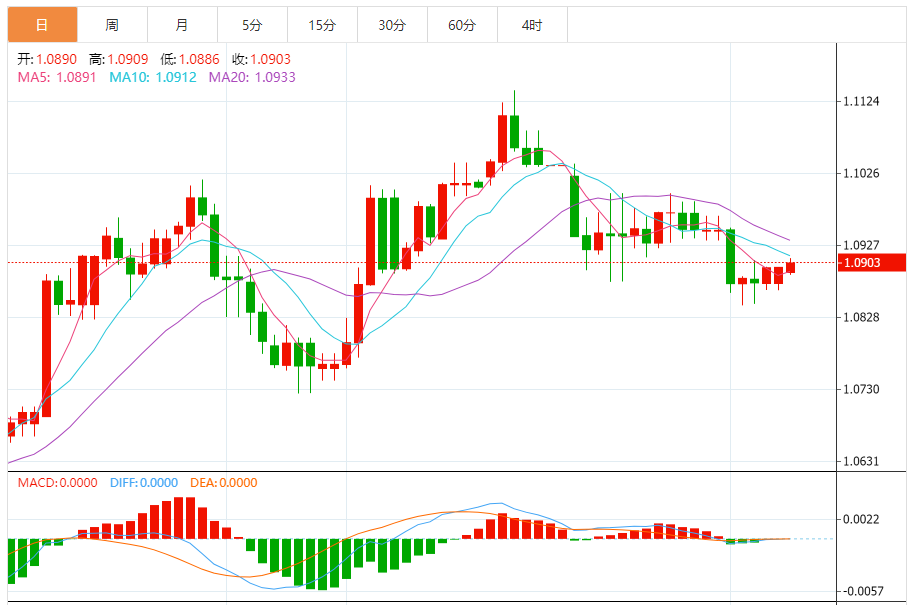 周一,欧元/美元徘徊于1.0903关口下方,现交投于1.0902附近,涨幅0.05%。
