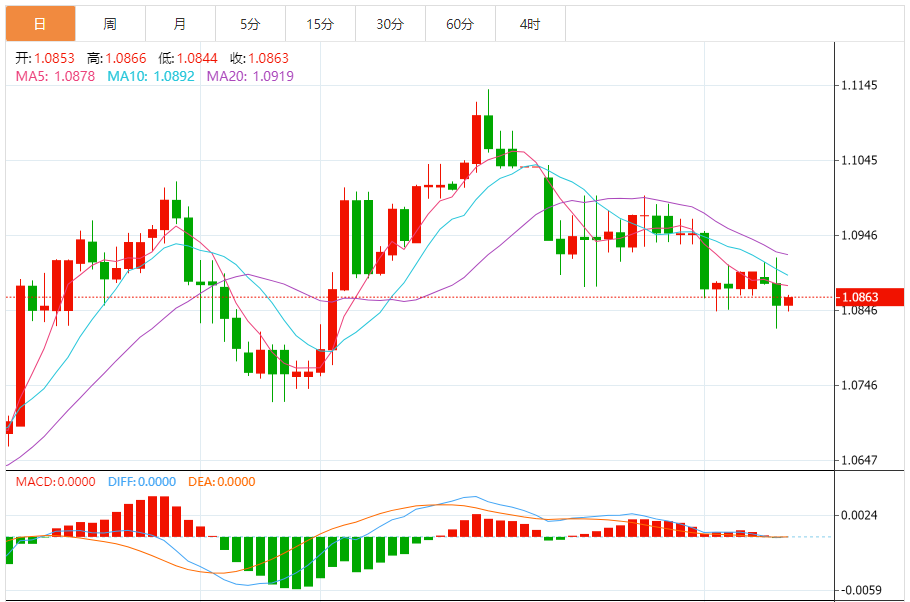 周三,欧元/美元徘徊于1.0865关口下方,现交投于1.0864附近,涨幅0.10%。