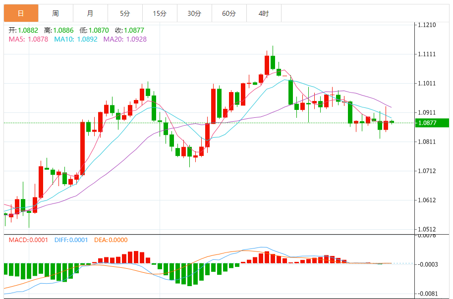 周四,欧元/美元徘徊于1.0876关口下方,现交投于1.0876附近,跌幅0.06%。