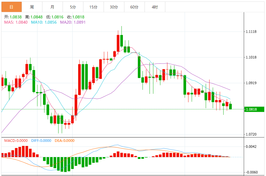 周三,欧元/美元徘徊于1.0819关口下方,现交投于1.0818附近,跌幅0.25%。