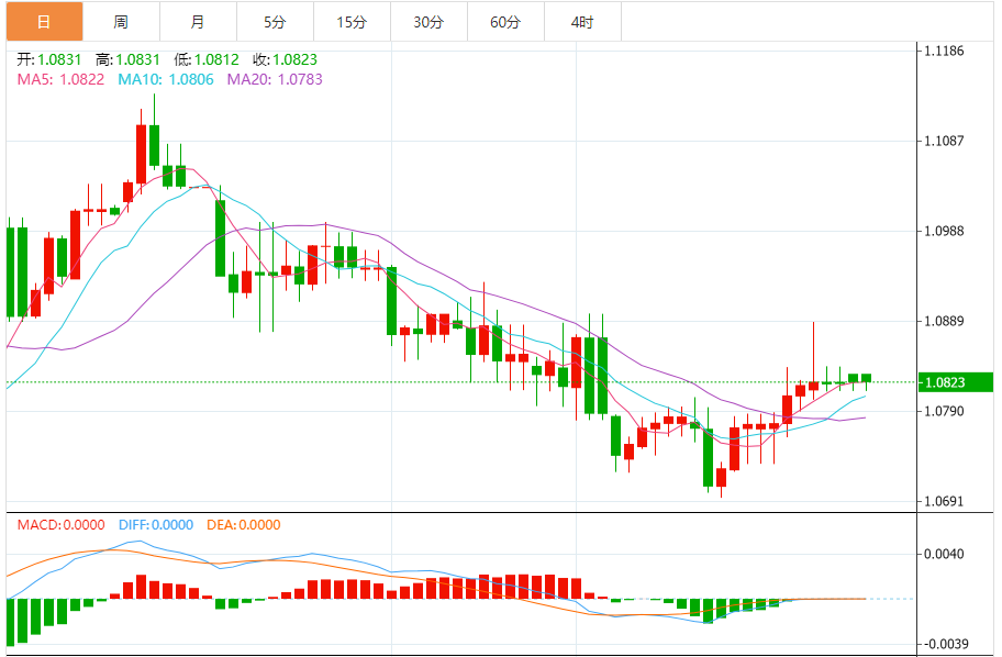 周一,欧元/美元徘徊于1.0823关口下方,现交投于1.0822附近,涨幅0.02%。