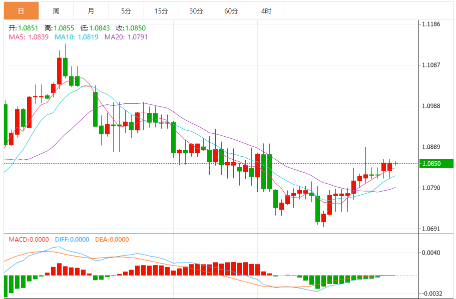周二,欧元/美元徘徊于1.0851关口下方,现交投于1.0850附近,跌幅0.01%。