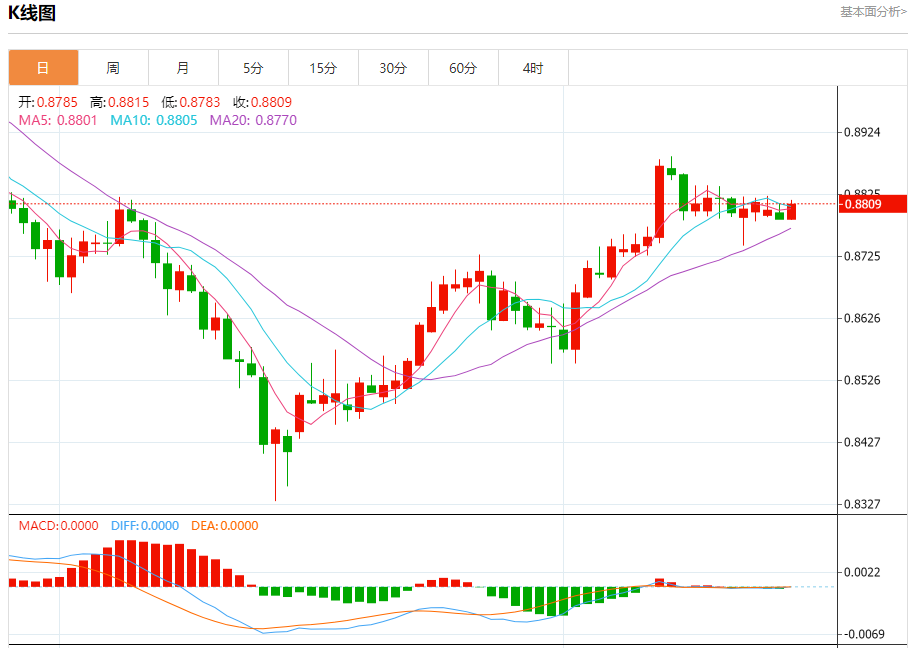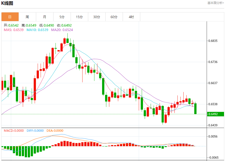 今日周三,澳元兑美元报0.6493,跌幅0.78%;美元兑加元报1.3600,涨幅0.53%;美元兑瑞郎报0.8811,涨幅0.28%。