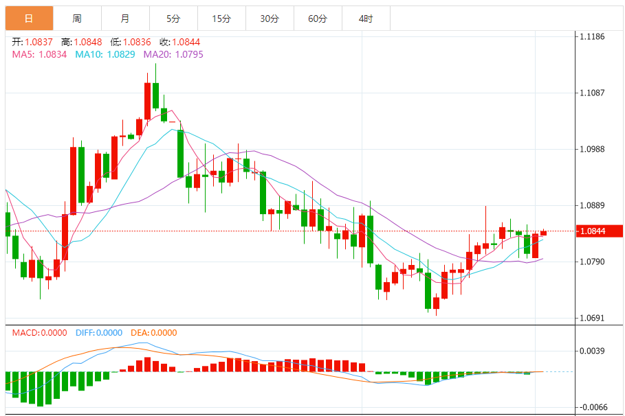 周一,欧元/美元徘徊于1.0845关口下方,现交投于1.0844附近,涨幅0.05%。