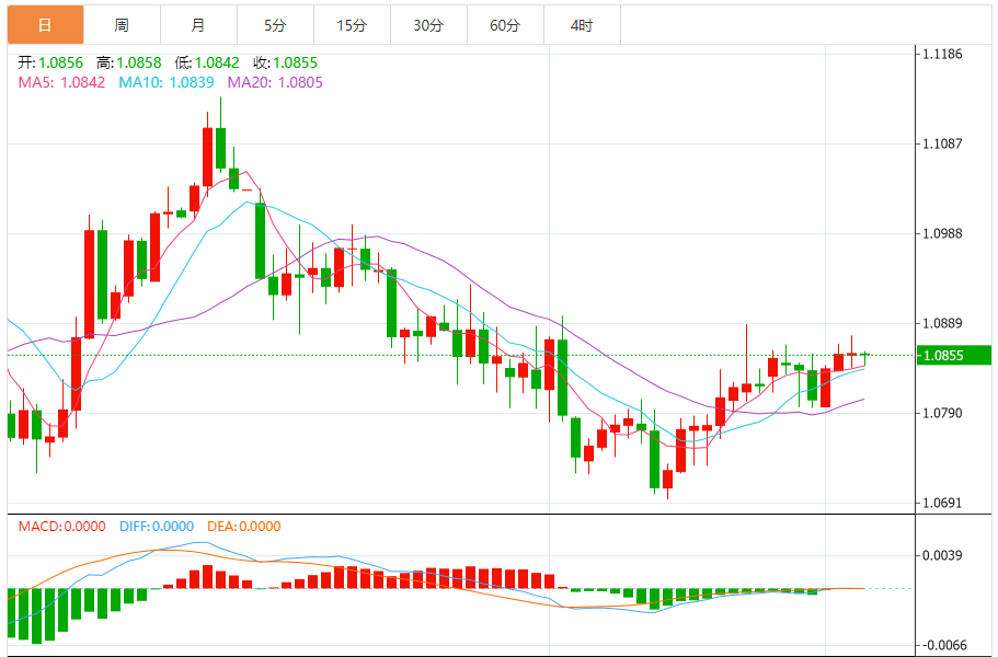 周三,欧元/美元徘徊于1.0856关口下方,现交投于1.0855附近,跌幅0.01%。