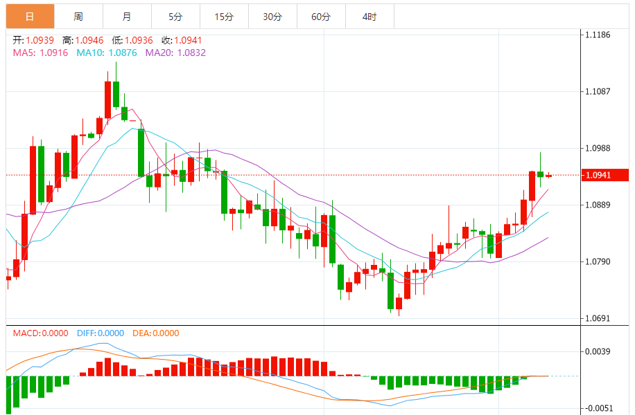 周一,欧元/美元徘徊于1.0941关口下方,现交投于1.0941附近,涨幅0.02%。