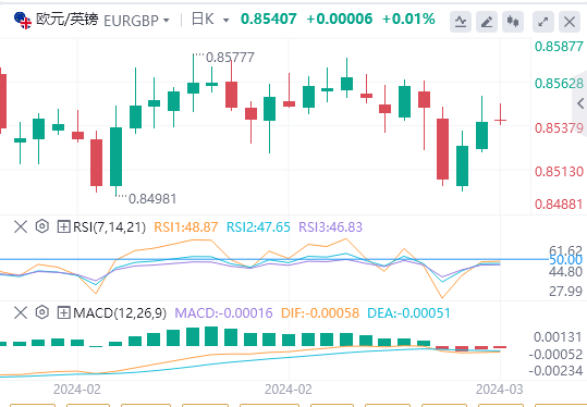 3月13日,周三欧市初盘,欧元/英镑在0.8550下方走高。英国数据好坏参半,该交叉盘随之走高。截至记者发稿时,欧元/英镑报0.8544,日内上涨0.04%。