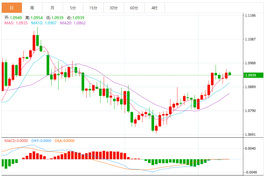 周四,欧元/美元徘徊于1.0940关口下方,现交投于1.0939附近,跌幅0.08%。