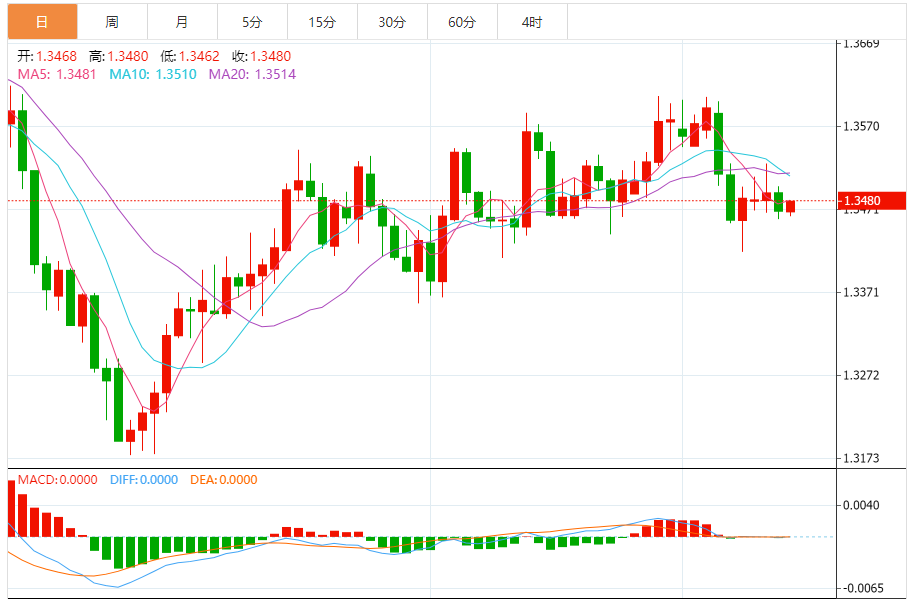 周四,美元/加元徘徊于1.3482下方,现交投于1.3480附近,涨幅0.09%。