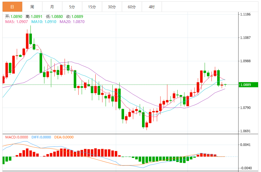 周一,欧元/美元徘徊于1.0889关口下方,现交投于1.0888附近,涨幅0.00%。