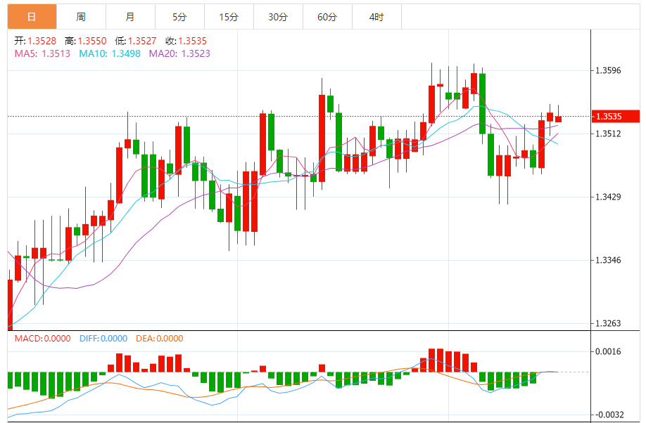 周一,美元/加元徘徊于1.3536下方,现交投于1.3535附近,跌幅0.04%。