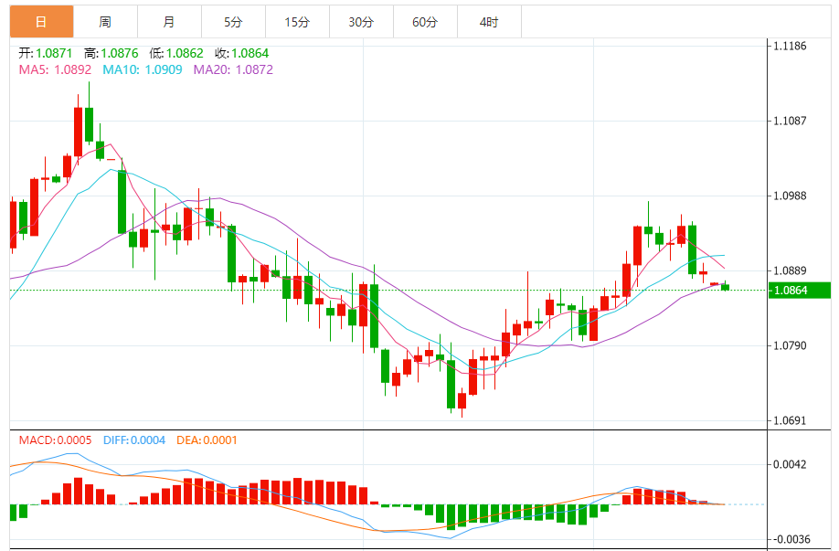 周二,欧元/美元徘徊于1.0866关口下方,现交投于1.0865附近,跌幅0.06%。