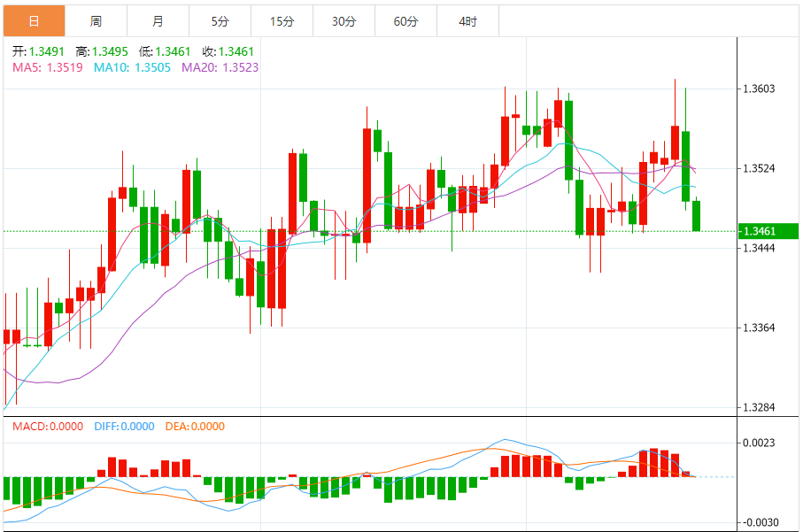 周四,美元/加元徘徊于1.3463下方,现交投于1.3464附近,跌幅0.21%。