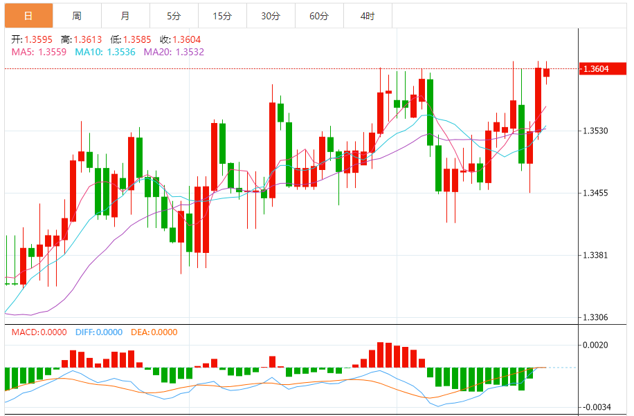 周一,美元/加元徘徊于1.3605下方,现交投于1.3603附近,跌幅0.01%。