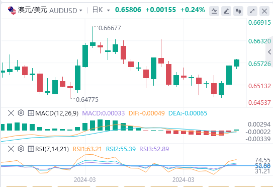 周三,受美国国债收益率下降和美元疲弱的提振,澳元/美元稳健上扬。美联储决策者讲话成为头条新闻,而美国经济数据喜忧参半,美国ADP就业人数变化数据强劲,但采购经理人指数疲弱。澳元/美元报0.6565,周四亚市早盘微涨0.02%。