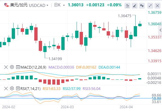 4月8日,周一欧市盘中,美元/加元吸引了一些逢低买盘,止住了从1.3650(上周五乐观的美国非农就业数据公布后触及的11月以来最高水平)附近的小幅回撤。备受关注的非农就业报告(NFP)显示,3月份美国经济新增就业岗位30.3万个,远高于一致预期和上月下调后的20万个。报告的其他细节显示,失业率从2月份的3.9%下降至3.8%,劳动力参与率从62.5%上升至62.7%。这表明劳动力市场仍然紧张,并助长了美联储(Fed)可能推迟降息的猜测。