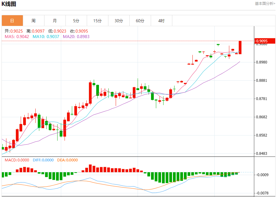 今日周三,澳元兑美元报0.6553,跌幅1.16%;美元兑加元报1.3646,涨幅0.55%;美元兑瑞郎报0.9094,涨幅0.64%。