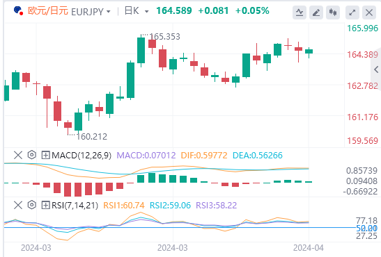 4月11日,周四欧市盘中,欧元/日元在164.15-164.10区域附近吸引了一些逢低买盘,并在欧洲时段的前半段攀升至新的日高。现货价格目前在164.65-164.70区域附近交易,目前似乎已经结束了连续两天的下跌,跌至周三触及的每周低点。
