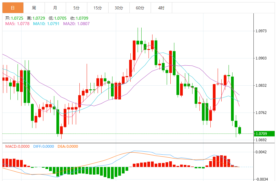 周五,欧元/美元徘徊于1.0710关口下方,现交投于1.0709附近,跌幅0.16%。