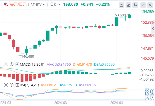 4月15日,周一亚市早盘,美元/日元开盘时短暂跌破153.00后,仍保持在153.50以下。交易员考虑到周末伊朗对以色列的袭击,使避险日元略有支撑。
