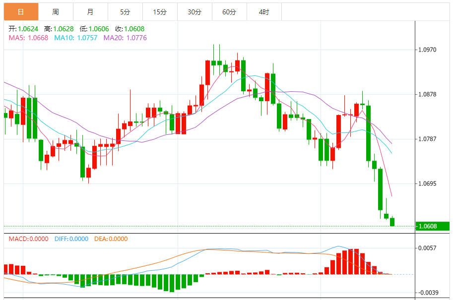 周二,欧元/美元徘徊于1.0608关口下方,现交投于1.0608附近,跌幅0.15%。
