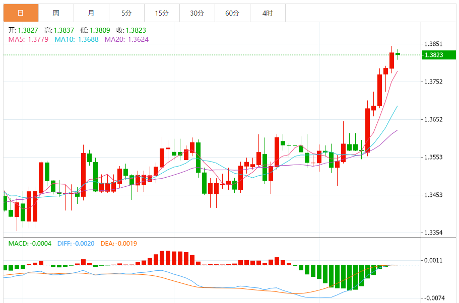 周三,美元/加元徘徊于1.3824下方,现交投于1.3822附近,跌幅0.04%。