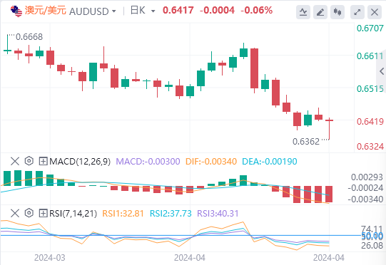 4月19日,周五欧市盘中,澳元/美元收复失地后仍处于负值区域。由于金融市场避险情绪加剧,高风险资产面临压力,澳元兑美元汇率下跌。在美国广播公司证实以色列导弹袭击了伊朗一处地点后,这种情绪加剧了,加剧了中东的紧张局势。