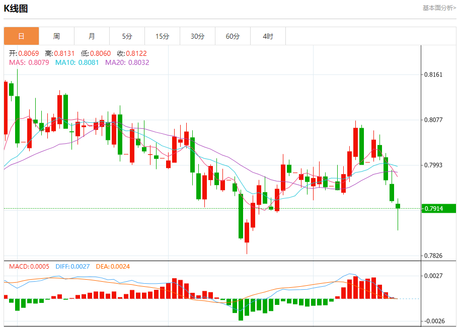 今日周五,澳元兑美元报0.6483,跌幅0.02%;美元兑加元报1.4039,跌幅0.12%;美元兑瑞郎报0.7916,跌幅0.11%。