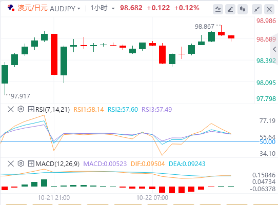 10月22日,周三欧洲早盘,澳元/日元交叉盘上行空间扩大至98.80附近。由于保守派高市早苗当选日本首相,日元兑澳元走软,交易员押注她的政府可能会混淆利率前景并带来更大的财政宽裕。